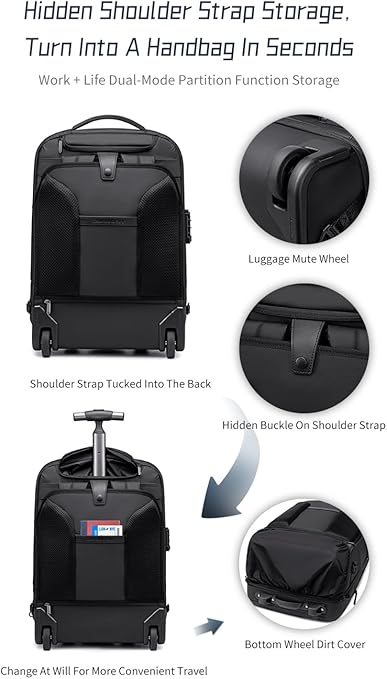 این کیف چندمنظوره بهعنوان کولهپشتی و کیف چرخدار قابل استفاده است و انعطافپذیری و راحتی را در سفر به شما ارائه میدهد. دسته چرخدار، بندهای شانه و چرخها به راحتی قابل مخفی شدن هستند که تجربه استفاده بهتری را فراهم میکند.