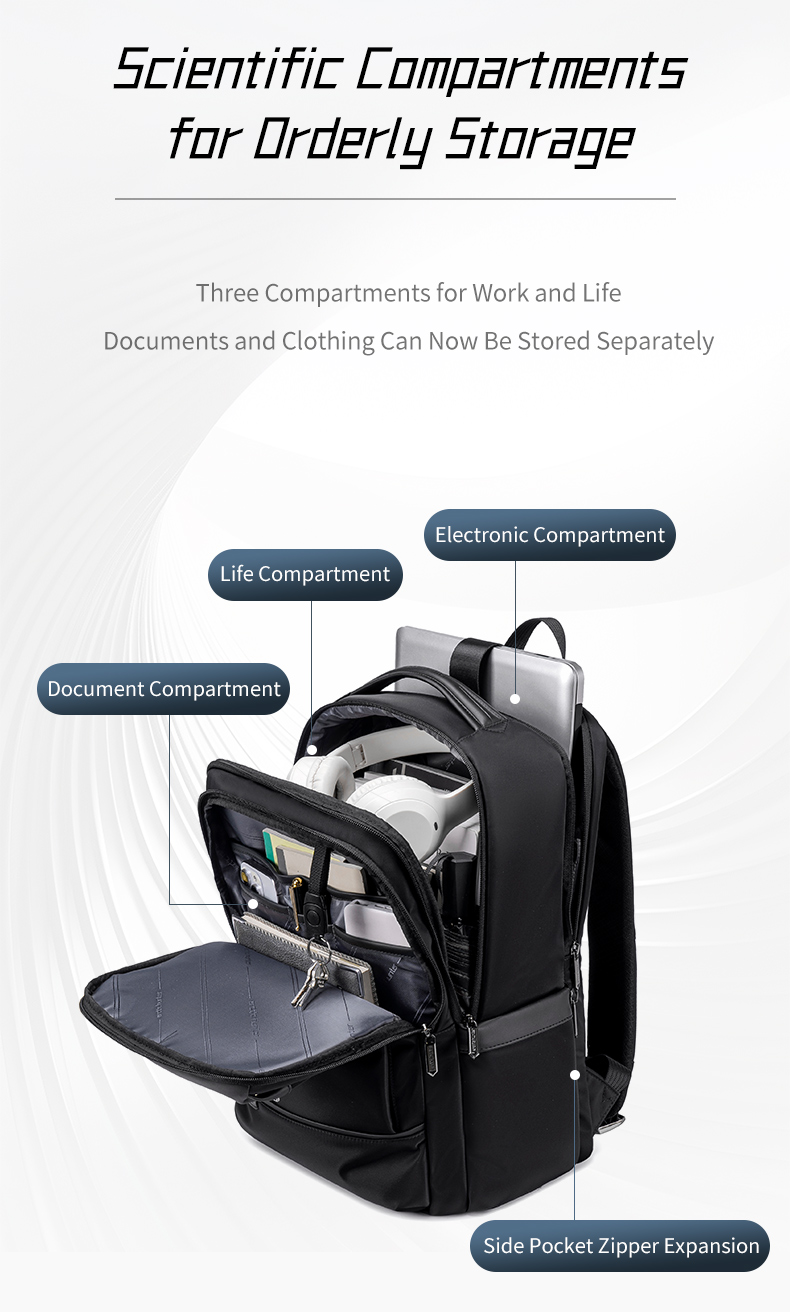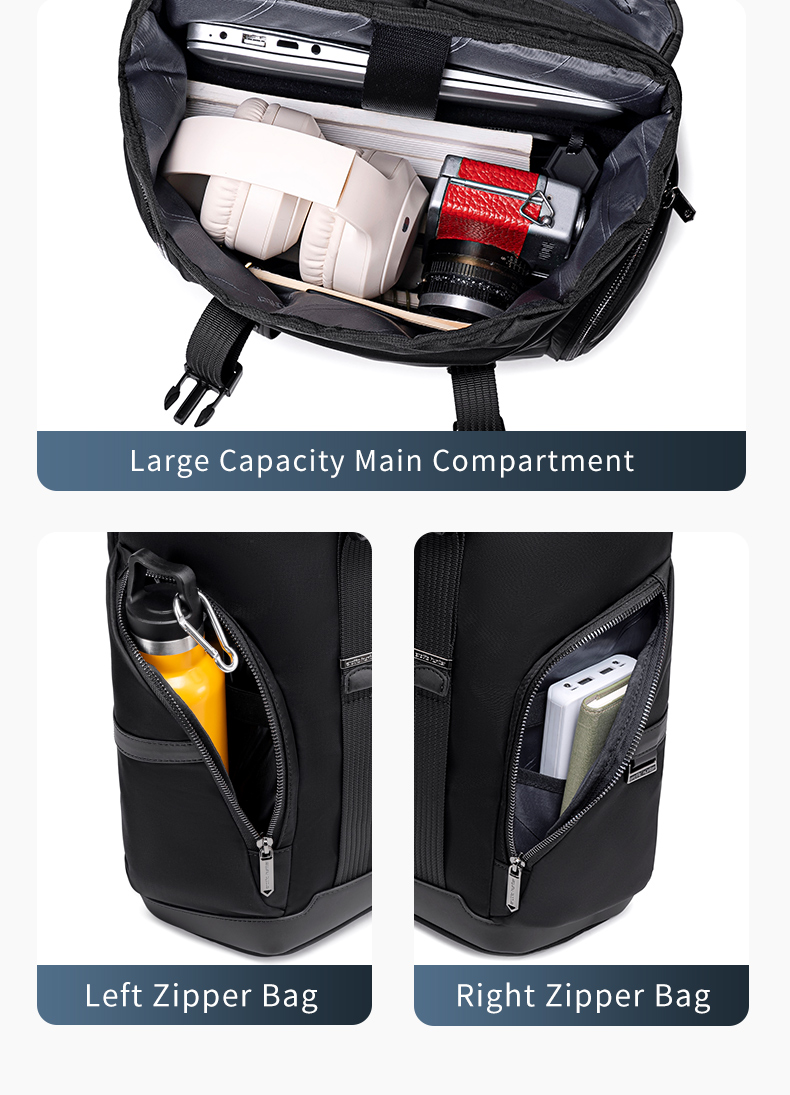 - سازماندهی هوشمندانه: بخش اصلی شامل شش جیب برای نگهداری دستگاههای الکترونیکی، خودکار، دفترچه، شارژر و غیره است. دو جیب جانبی فضای اضافی را فراهم میکند، یکی برای نگهداری بطری ضدآب با بند محافظ و دیگری با جیب و دو بند برای اقلام اضافی. یک جیب زیپدار مخفی در پشت کولهپشتی برای نگهداری امن اشیاء قیمتی مانند کیف پول و گذرنامه طراحی شده است.
